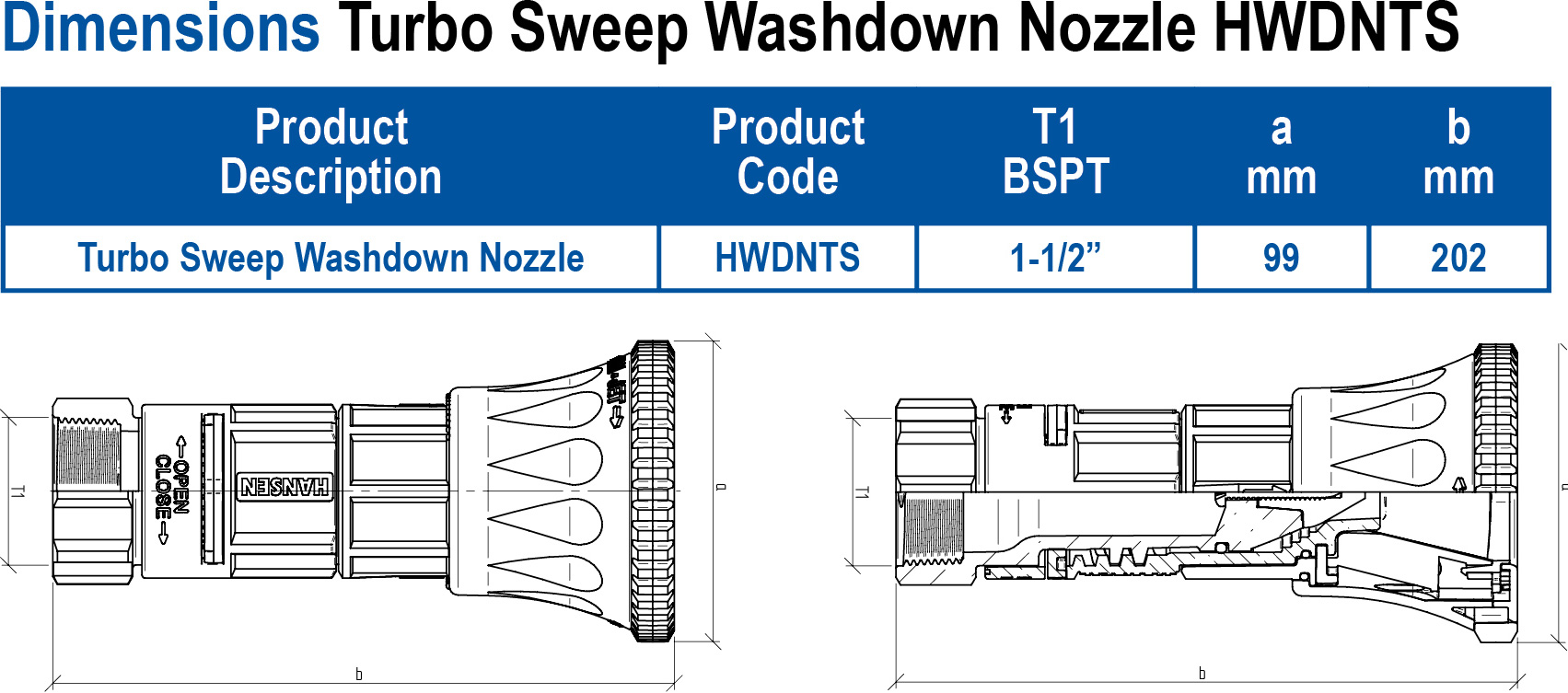 The Turbo-Twist is available in a range of versatile connect styles for 25mm to 50m wash-down hose and male or female threaded end connections for custom applications.